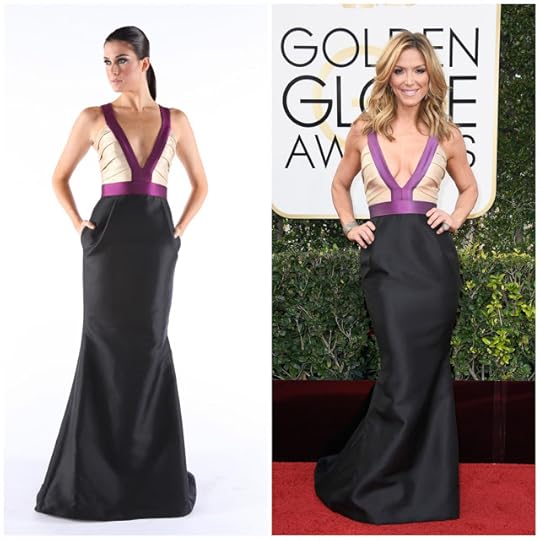 Debbie Matenopoulos in NIKOLAKI by Nick Verreos & David Paul: The ever-so-fabulous Debbie Matenopoulos, co-host of  Hallmark's "Home & Family" TV Show, wore one of our NIKOLAKI gowns at the 2017 Golden Globe Awards Red Carpet and naturally, I think she was one of the BEST DRESSED of the Golden Globes as well as 2017! The gown was a color-blocked column style gown in black/golden creme/raspberry colored silk/wool ziberline and featured pleated sides, a plunging neckline, as well as side pockets: Fabulous!