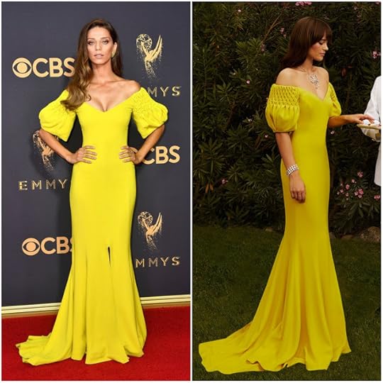 Angela Sarafyan in Elizabeth Kennedy Resort 2018: "Westworld" actress Angela Sarafyan looked gorgeous in this chartreuse colored gown from NYC-based designer Elizabeth Kennedy and her Resort 2018 collection. I adored the color (naturally!) and the fit was exquisite. But one of my favorite details were those voluminous sleeves with "Elizabethan" smocking details. Sarafyan here was one of the BEST of 2017 Red Carpet.