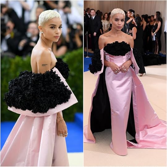 Zoe Kravitz in Oscar de la Renta: Zoe Kravitz wore this Millenial Pink gown from Oscar de la Renta designers Laura Kim and Fernando Garcia. The duchesse silk satin gown featured an overcape and bust accented with black ruffled embellishments. Kravitz looked regal and supremely chic, especially with that bleach-blond pixie hairstyle. I loved the juxtaposition of her almost-punk severe look and the Alta Moda "old school" style of this beautiful gown.