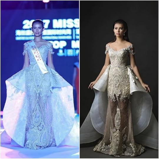 11. Miss World Indonesia Achintya Holte Nilsen: Achintya wore this beautiful creme colored gown from Indonesian brand and designer, Provocate by Melta Tan. to the Miss World 2017 Designer Dress Fashion Show/Top Model Competition, and not surprisingly, it was judged to be the BEST design. The gown was gorgeous and very Haute Couture in its style, design and perfect fit. The dress featured that very popular "nude dress" look with a see-through ivory colored silk tulle base with gold sequin applique/embroidery. The design was topped off with a stiffened overskirt that had a sweeping train and the same gold applique that was featured in the main dress. It was pretty much THE PERFECT Miss World gown and one of the Best of 2017.