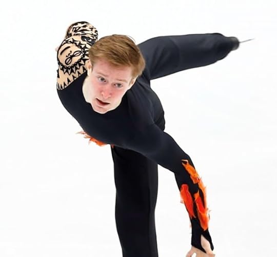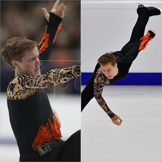 Alexander Samarin of Russia Free Skate to La Naissance de Yaha by Saint-Preux, The Unforgiven III by Metallica and House of the Rising Sun performed by Dave Evans--Russian men's figure skater Alexander Samarin wore this rather "kooky" costume above for his "rocker" Free Skate. The music was hard rock/metal and his costume reflected this in a, shall we say, "unusual" costume way. The top had orange colored "fire" accents (?), a nude illusion with black tribal tattoo sleeve (just one) and for the Rocker/Headbanger Cherry on the Cake...take a look at that skull belt buckle! I know, it's a lot of costume madness.