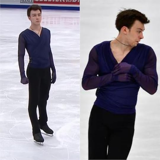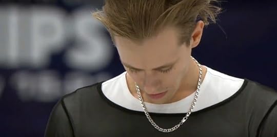 Human (MJ Cole Remix) performed by Rag'n'Bone Man--Michal skated his Free Skate to the soul/hip-hop/pop song  "Human", wearing this modern look above. The "costume" consisted of skin-tight black pants, a lose gauze draped top and white t-shirt underneath, accessorized with a thick silver necklace. The look was "Euro Hipster at a Club" which I guess was appropriate for the music. I just wished that he would lose the necklace and instead, maybe add some silver crystals onto his shirt.
