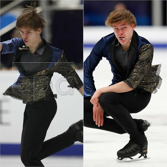 Deniss Vasiljevs of Latvia Free Skate to Put the Blame On Mame by Doctor 3, Anyone to Love and Sway by Michael Buble--For his Free Skate, Deniss went for a "Lead Singer of a Las Vegas Band"-look with his shimmering costume. The look had tuxedo-like pants, dress shirt and a bi-colored jacket featuring one gold lace side as well as a blue one. Even though it was a bit Eastern European-like Eurovision "kooky", this was a "costume" that I could totally see Michael Buble wear in one of his concerts so it seems appropriate that this was Deniss' choice so...I'll give him that!