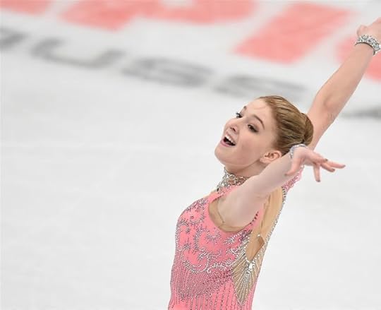 Maria Sotskova of Russia Short Program to Swan Lake by Petr I. Tchaikovski--Maria wore this pink sequined costume for her Short Program and it was beautiful. In the beginning of the season--at 2017 Skate Canada International , she was still wearing an older costume (from the previous season) and I wondered if she was going to change it or if a new one was being made and it wasn't ready yet. Well, yes and yes were the answers to my questions. I loved this elegant costume featuring a pink chiffon base with 19th Century-like design details reminding me of a Romanov Russian Princess. The rhinestone-studded necklace, bracelets and bodice embellishment were superb! I also loved that back.
