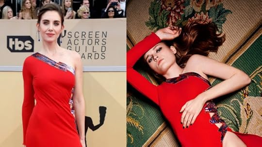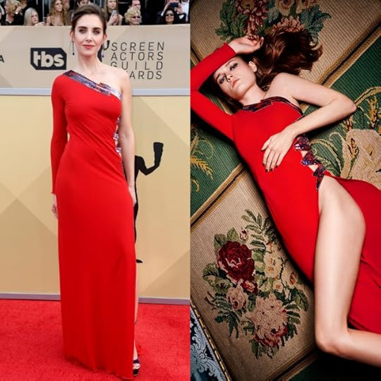 Alison Brie in Peter Dundas Pre-Fall 2018--Netflix "Glow" star, Alison Brie, wore this red one shoulder gown at last night's 2018 SAG Awards. The dress was from designer Peter Dundas and his Pre-Fall 2018 collection. The collection is described as a "Ziggy Stardust lightning bolt embroidery" 70's-inspired collection, as you can see from the sequined trim on her gown. I thought this was a fun gown choice since it also had a slight homage to her "Glow" costume/leotards. The jersey knit dress also featured a cut-out side, one long sleeve and high side slit that was closed slightly for Alison (notice how open it is on the model, photo above). The gown style was very 70's sexy...