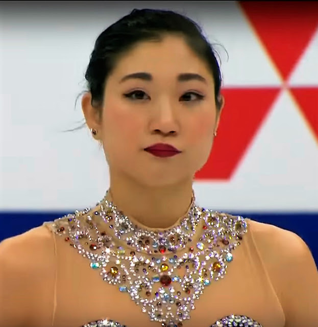 Mirai Nagasu of USA: I've talked about her Season 2017-2018 costumes HERE when was at the 2017 Rostelecom Cup but it was a nice surprise to see a NEW COSTUME for her Short Program to Nocturne No. 20 in C Sharp Minor by Frederic Chopin, which was the same music for her last season's Short Program. This new Cabernet-red colored design featured a stretch lace bodice/sleeves/skirt with silver rhinestone studded front bodice. It was OK but, frankly I liked last season's costume better: