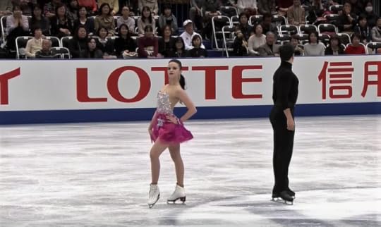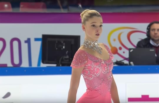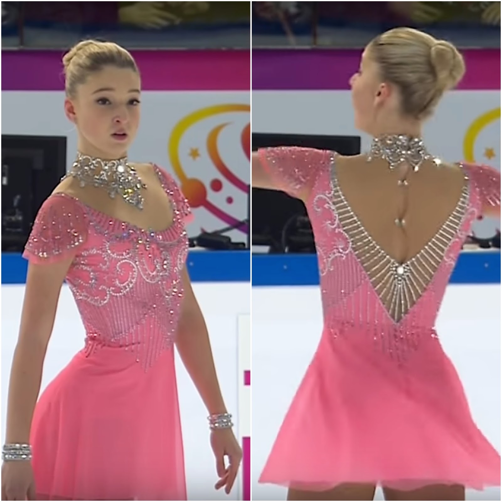 Maria Sotskova of Russia: Maria wore this pink costume for her 2017-2018 Short Program to Swan Lake by Petr I. Tchaikovski, and IT WAS BEAUTIFUL! I loved this elegant costume featuring a pink chiffon base with 19th Century-like design details reminding me of a Romanov Russian Princess. The rhinestone-studded necklace, bracelets and bodice embellishment were superb! I also loved that back. I was thrilled to see that this was a NEW COSTUME for her.  At the last Grand Prix she competed at-- 2017 Skate Canada International --she wore this: