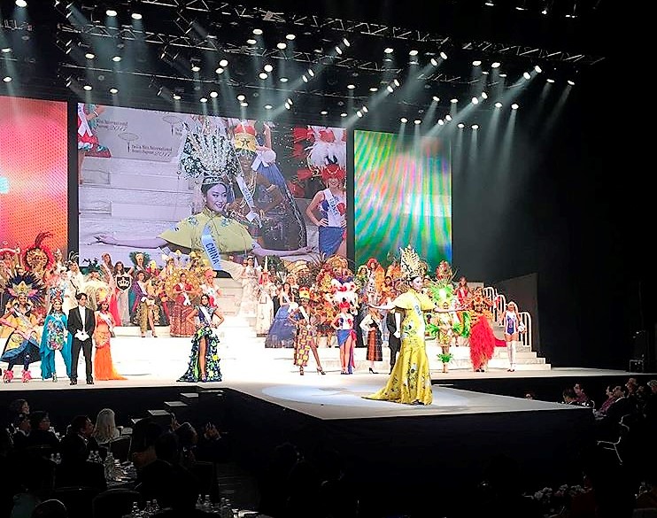 Miss International Peru Tiffany Lopez: Tiffany wore a costume depicting an "Allegorical Costume" created by the Institute of Nina Design showcasing the riches of the Inca rulers with the gold and turquoise details.
