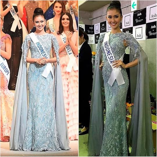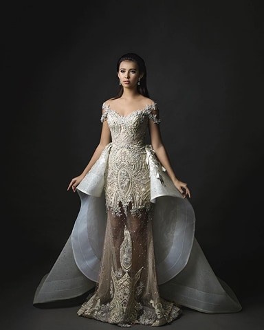 1. Miss World Indonesia Achintya Holte Nilsen: Achintya wore this beautiful creme colored gown from Indonesian brand and designer, Provocate by Melta Tan. And yes, she--or her dress--was judged to be the BEST design from the Miss World 2017 World Designer Fashion Show. The gown was gorgeous and very Haute Couture in its style, design and perfect fit. The dress featured that very popular "nude dress" look with a see-through ivory colored crinoline base with gold sequin applique/embroidery, topped off with a stiffened overskirt that had a sweeping train and the same gold applique that was featured in the main dress. It was pretty much THE PERFECT Miss World gown.