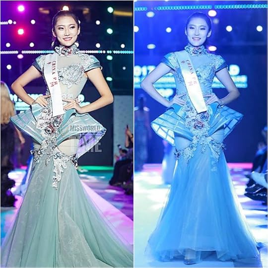 7. Miss World China PR Guan Siyu: The "Host Candidate" from the People's Republic of China had the pressure of making her nation's fashion designers proud with her gown choice for the Miss World/World Designer Fashion Show & Top Model Competition...and I think she did quite well! There were elements of Parisian Haute Couture--the fit, silhouette, expensive fabrication, Marie Antoinette mini panier--as well as hints of Chinese Traditional Dress with the neckline/collar, cap sleeves, embroidery. This was a strong World Designer Statement for the beautiful contestant from China. If there was any wish, it would have been stronger more "Runway Diva" hair.