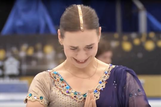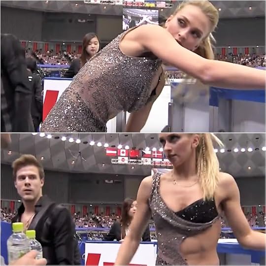 And I remembered that she had worn THIS SAME COSTUME for last season's Free Skate to different music (not "Swan Lake"). I also said something to the effect of "either her team is being cheap or I.S.U. isn't giving the Russian skating federation enough funds. In addition, I also wished that she would have worn A NEW COSTUME. As it turns out, I guess her new costume just wasn't ready.