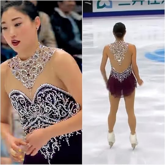 Free Skate to Pictures At An Exhibition by Modest Mussorgsky: For her Free Skate, Yuna wore this maroon/deep purple-colored costume above. It had silver jeweled sequins and a small nude illusion panel. It was nice and I especially loved the heavy-to-light effect of the rhinestones. She also added a matching color hair bow.