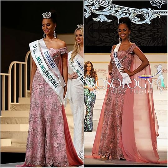 Puerto Rican designer Carlos Alberto: From the looks of it, it was inspired by that iconic Miss World crown and the colors in it. He used thousands of Swarovski crystals to create the very impacting jeweled details and embellishments that really made this gown ONE OF THE BEST IN A LONG TIME when it comes to pageant gowns. I really, really hope someone paid him A LOT of money for this, because YOU KNOW this will be knocked off by less expensive pageant gown manufacturers and he will not make a dime out of that--and we also know that just making a gown for free for a Miss World or Miss Universe isn't going to get 10,000 orders! Soooooo, let's just hope he was compensated VERY HANDSOMELY for this gorgeous one-of-a-kind gown! He's worth every dollar. Stephanie looked like like an Azure Caribbean Queen in this. One of the BEST handing-over-the-crown gowns IN A LONG TIME!