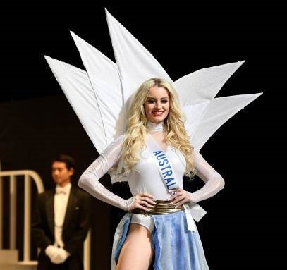 Miss International Vietnam Huynh Thi Thuy Dung: As you can see above, Miss International Vietnam wore this feathered fantasy costume featuring oversized wings, exaggerated extra long sleeves, replicas of swans in her front torso AND...Lucite heel SUPER platforms! Now, I get the White Swan costume and hints of an Ao Dai somewhere in this but...those shoes were just TOO MUCHEY. Even for a costume.