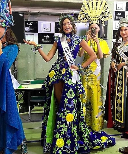Miss International Colombia Vanessa Pulgarin: Designed by Sergio Perez Atelier--according to the lovely contestant, the colorful costume depicts the magical story of "Fura & Tena" which is part of the culture in the zone of Boyaca, an area rich in emeralds. Fura and Tena are two mountains situated over the river Guaquimay. Not sure what any of that means but I do love the scenes of butterflies and flowers and perhaps the river (the blue in her dress?). It's quite a beautiful costume for sure!