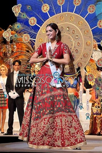 Miss International India Ankita Kumari: India always brings it when it comes to making a costume statement (and why not?) and this one worn by India's Ankita Kumari was well done. The red with gold sequined paillette skirt is GORGEOUS (I want that hanging on a wall like art!) and of course, who doesn't appreciate a HUGE peacock feathered circular back "wing"??!! I do.