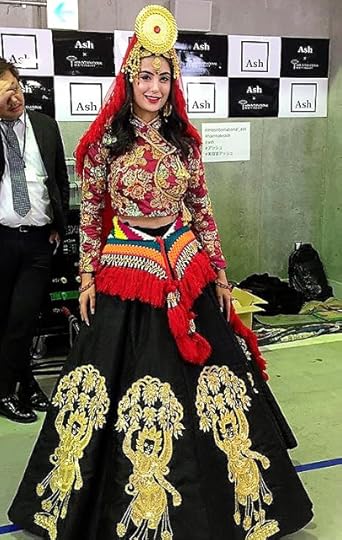 Miss International Nepal Niti Shah: Niti Shahh wore this Traditional nepali costume featuring a full black skirt with gold embroidered deities, a gorgeous multicolored waist/hip accessory, silk brocade top and gold headdress.