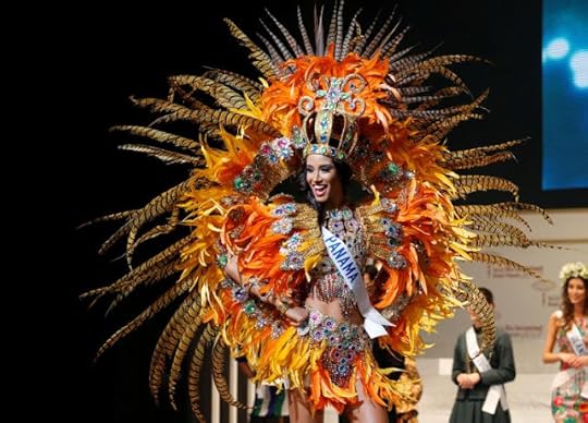 Miss International Panama Darelys Santos: The tall and slim Panamanian beauty Darelys Santos wore a "Congo Queen" costume, inspired by the traditional dances from the Atlantic Coast. the traditional costume usually features a patchwork pollera skirt of different fabrics, but here she instead gave it a Pre-Columbian Feathered Empress twist. I like it!