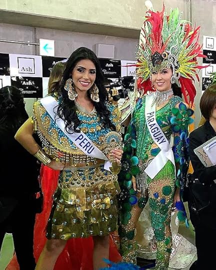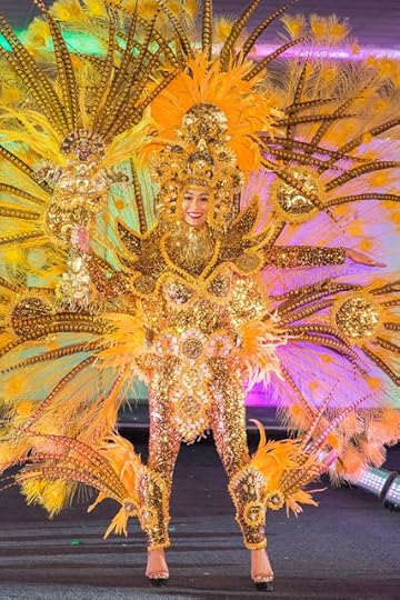 Miss International Bolivia Carla Maldonado: Carla's costume consisted of a gold sequined bodysuit and an attached overskirt/cape in the same gold sequined fabric. The overskirt was also covered in hundreds of turquoise and aquamarine colored feathers. it was all topped off by a "Carnival"-like feathered mask. It was very festive and stage impacting.
