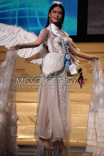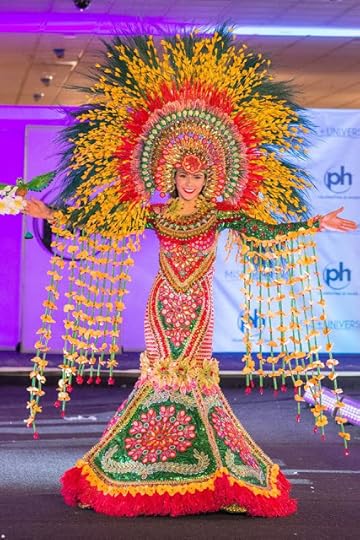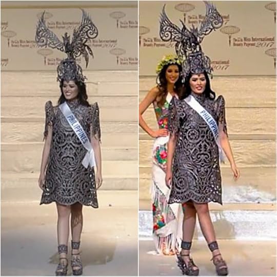 Miss International Philippines Maria De Leon: Maria wore a fantasy/modern version of the Filipiniana Terno. The steel gray colored costume was designed by Cary Santiago  and featured an intricate Sarimanok (a mythical bird) headdress (above photo) to match. I thought this was a unique take on the traditional Filipina dress but one still saw the references with the "Butterfly" sleeves. The elaborate embroidery was quite stunning and I liked how it was followed throughout, even down to the shoes. I just wished it was more fitted. A fit-and-flare--or mermaid-shaped version--of this would have been PERFECT!