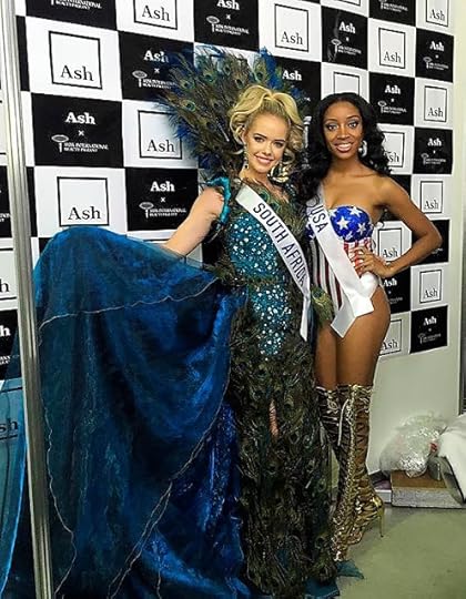 Miss International South Africa Tayla Skye Robinson (with Miss International USA Shanel James): Tayla's costume was a a "Peacock Queen" and featured LOTS and LOTS of peacock feathers, a jeweled sequined upper torso, more peacock feathers as a stand-up back collar and a sweeping royal blue iridescent overskirt.