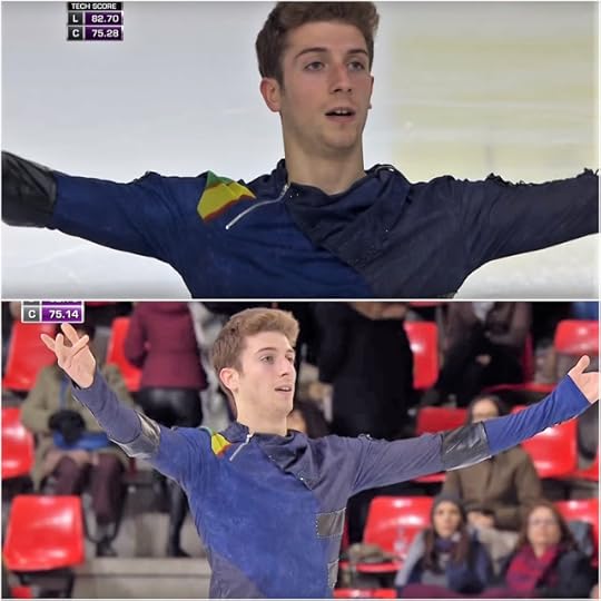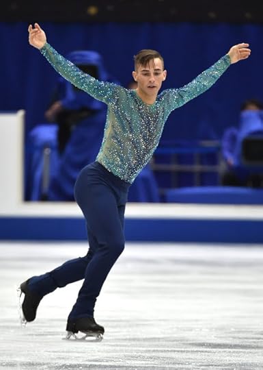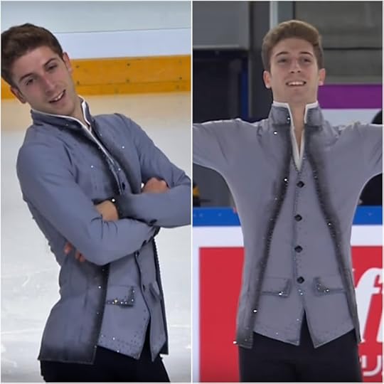 Jason Brown: I discussed Jason Brown in my 2017 Skate Canada International costumes blog HERE but if I am not mistaken, I think Jason (kind of) changed his costume...kind of! For his Free Skate to Inner Love by Maxime Rodriguez at 2017 NHK Trophy, he wore this beautiful stretch velvet blue dégradé top with silver sequined accents. For the pants, he donned dark indigo-colored stretch velvet pants. So...what was different? ....