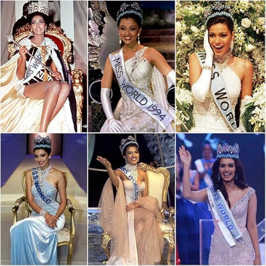Six Beauties--Miss World winners from India: (Clockwise, left to right) Reita Faria (Miss World 1966), Aiswarya Rai (Miss World 1994), Diana Hayden (Miss World 1997), Manushi Chhillar (Miss World 2017), Priyanka Chopra (Miss World 2000), and Yukta Mookhey (Miss World 1999).