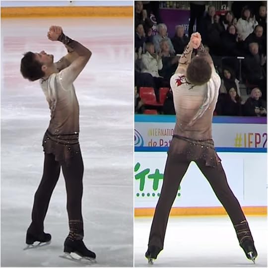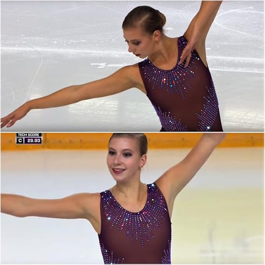 I was right! On the left is the costume at 2017 Rostelecom Cup and on the right is what she wore this weekend in France. Rhinestones on the once-basic Peter Pan collar--as well as on her cummerbund, front button placket and wrist bands. Back when I saw the costume at the Rostelecom Cup I thought it just needed something. I guess someone must have read my blog (wink! wink!).