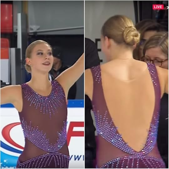 I really liked this costume last season, and I still do. This is what I said in my 2017 Rostelecom Cup Costumes Recap when she wore this again: "Would I have wished she might have 'changed' the costume just a teeny-tiny bit? Maybe. But, this is so outstanding that heck, why not? Give it a second run! Since is the first event of the season, I'm kinda hoping these repeat program gals and guys will at least give us a switch in costumes. One can only hope!" And she did. But maybe, I just wanted something better.