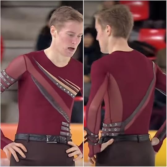 Free Skate to La Naissance de Yaha by Saint-Preux, The Unforgiven III by Metallica and House of the Rising Sun performed by Dave Evans--This costume was a bit of Rock & Roll, a bit "Punk" and a but OH NO IS THAT A "ROSS DRESS FOR LESS" BELT???!!! I liked the maroon-colored solid/sheer top with the faux leather belt strap details and I got the point of the costume in terms of his music. But...THAT BELT!!!??? Why Oh Why can't Figure Skating Costume designers come up with an alternative? Or at least, be creative enough to design a belt that goes with the costume--maybe one just like the faux leather straps on his top? Seriously...Is it that difficult?