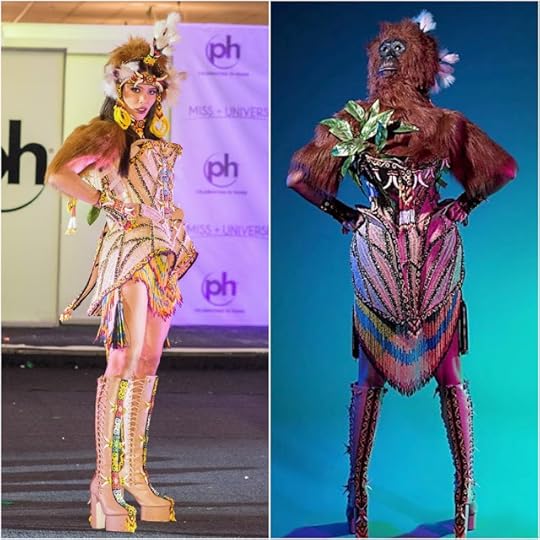 Miss International United Kingdom Ashley Powell: This had to be one of the, shall we say "unusual' costumes of Tuesday night's Miss International 2017 Beauty Pageant. Miss United Kingdom was literally CARRYING a red with faux ermine trim caped GOLDEN LION! And huney, I was like "yep! I TOTALLY get it! She's from Great Britain!". In fact the costume is inspired by the Royal Arms of England, a coat of arms showcasing lions. I think it's definitely VERY original and at the same time, showing something of the UK culture. Listen, at least she's not carrying a plate of fish & chips on her back! Then again, that could be fabulous too...if the fish was completely done with golden Swarovski crystals!