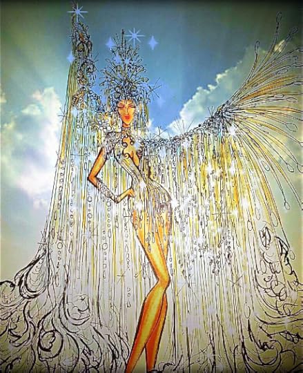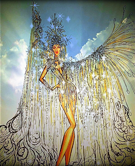 Miss Universe Guyana Rafieya Husain: Miss Universe Guyana’s costume (sketch above) stands eight feet tall and cascades over 10 yards of beaded silk organza. It is layered with over 20,000 crystals and 100 yards of crystal strands, ending in a plume of white spray. This is all done in a relief asymmetrical design, rich in gold and topaz tones. The piece titled “The Jewel of Guyana”, was designed by Zara Khan and is an artistic depiction of the majestic Kaieteur Falls. Can't wait to see the actual costume!