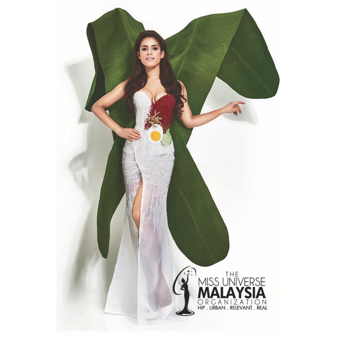 Miss Universe Malaysia Samantha James: One of the most talked about national costumes for the upcoming Miss Universe 2017 Beauty Pageant is this one for Miss Universe Malaysia. The costume is inspired by A DISH...in fact, by Nasi Lemak, the beloved national dish (usually served for breakfast) of Malaysia featuring fragrant rice cooked in coconut milk and pandan leaf. The dress designed by Brian Choo and features hand embroidered rhinestones to symbolize rice grains. On the left side of the dress, there are red rhinestones to symbolize the spicy sambal that accompanies each Nasi Lamak dish. Complete with accessories illustrating other accompaniments such as sliced cucumbers, fried peanuts, anchovies and an egg! Just look at the close-up photo of all the amazing sequin work! Speaking of work, the gown took 400 hours of craftsmanship and a month to make. OK, I could do without the anchovies (me NO LIKEY!) but otherwise, this costume makes me VERY HUNGRY!