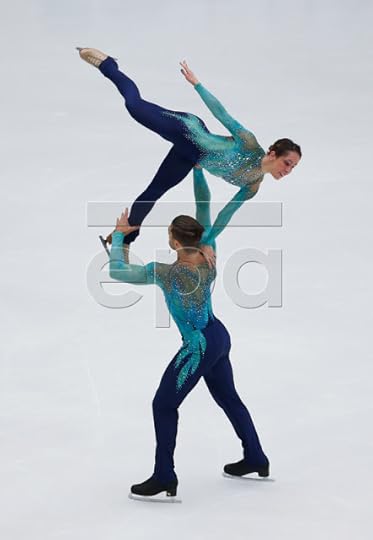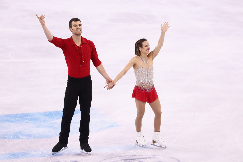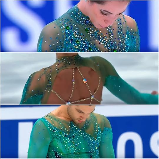 Meagan Duhamel and Eric Radford of Canada: Duhamel and Radford of Canada skated their Short Program to With Or Without You by U2 performed by April Meservy and these costumes were VERY NICE! They looked like A PAIR and the delicate crystal details were pretty--I especially liked how they were brought onto his shirt. I was just a bit bewildered by the triangular crystals on Meagan's waist. I get that it was probably supposed to be a belt/waistband detail but, it was just oddly placed and the high waist was odd and cut her body in half.