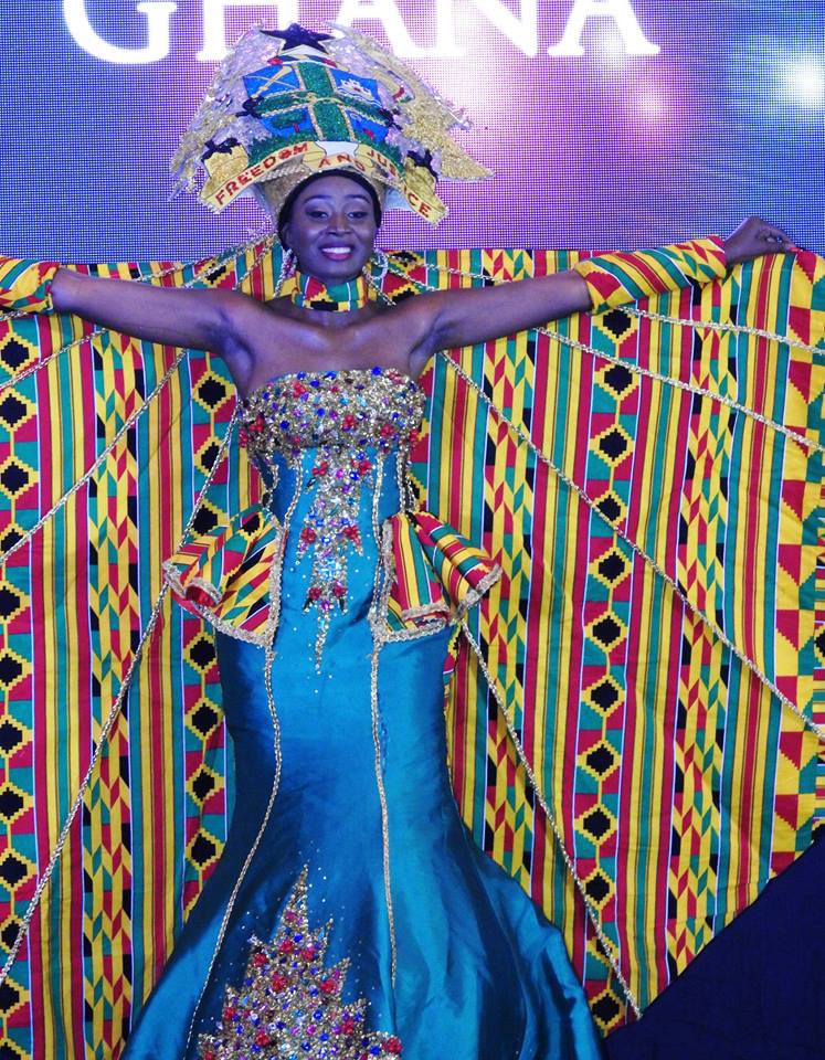 5. Miss Earth Ghana Maud Fadi: "Miss Earth Ghana" was my 5th Best and the highest spot for a contestant form Africa. I was blown away by her presentation (she came out covered partially using her cape) and then opened it up to reveal the fabulous Kente cloth patterns. The aqua blue mermaid-shaped gown featured multicolored sequins at the bust and torso as well as bottom portion of the dress--and if that wasn't enough, it had a matching Kente cloth pleated peplum. Oh, and then there was her Ghana Coat of Arms headdress! This was a National Costume MOMENT Ladies & Gentlemen!
