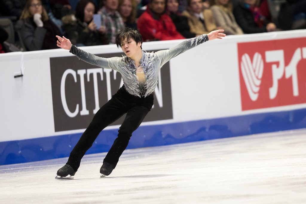 Free Skate to Turandot, Nessun Dorma (from "Turandot") by Giacomo Puccini, performed by Jose Carreras--Shoma Uno wore this costume for his Free Skate. it consisted of black pants (of course!) and an intricately detailed royal blue top. The top was striking and impacting. It featured a "plunging neckline" (demurely covered by nude illusion), and gold sequin applique highlighting his neckline and upper torso. It's obvious Shoma Uno LOVES a FABULOUS top for his skates and this follows this style pattern. In case you were wondering, this program was a REPEAT PROGRAM (The Season of Figure Skating Groundhog's Day!): This "Turandot" program was the same as Season 2015-2016 but THANK GOODNESS, not the same costume. this is what he wore then: