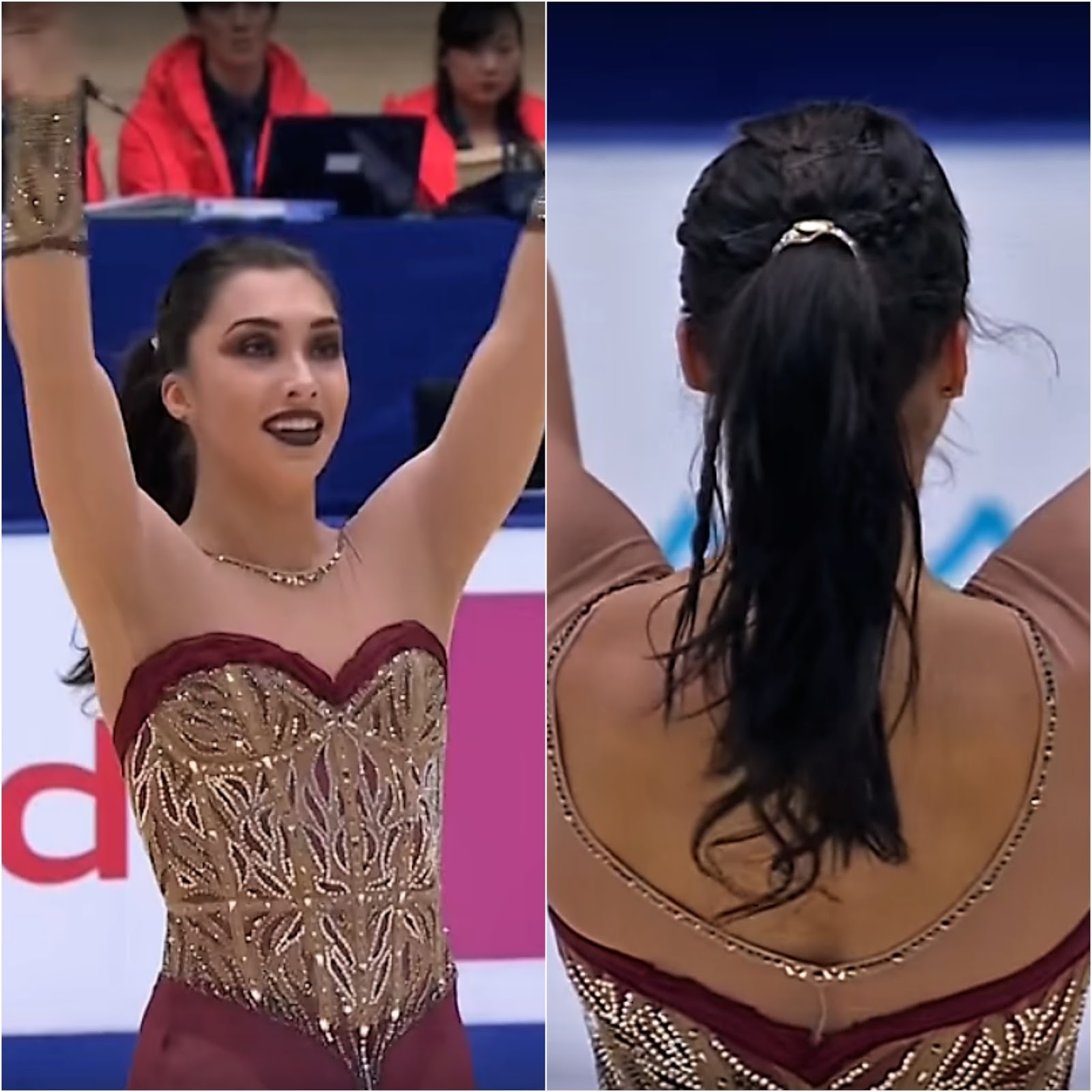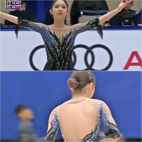 Free Skate to Across the Sky - Instrumental by Rag N'Bone Man and Caught Out in the Rain by Beth Hart: For their Free Skate, I liked Madison's dress but Zachary's black-and-white outfit left a lot to be desired. First, her deep gray sequined dress was beautiful, fluid and fashionable. But his...well, it didn't live up to her costume; instead, he looked like a waiter at a restaurant AFTER the restaurant closed! The Lycra jacket was flimsy and the open shirt look was inelegant. STEP IT UP Zachary. You deserve better!