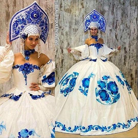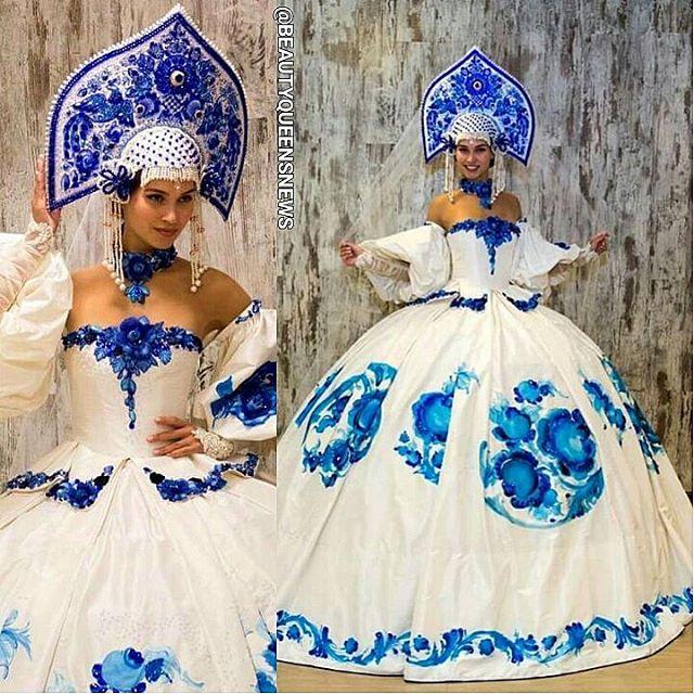 Miss Universe Russia Ksenia Alexandrova: Ksenia showed off her Miss Universe Russia national costume which features a big ballgown skirt, strapless bustier, billowy sleeves and that very iconic Russian headdress. This was inspired by the Sarafan "Boyarka"/Russian folk dress that features those blue hand-painted flowers.