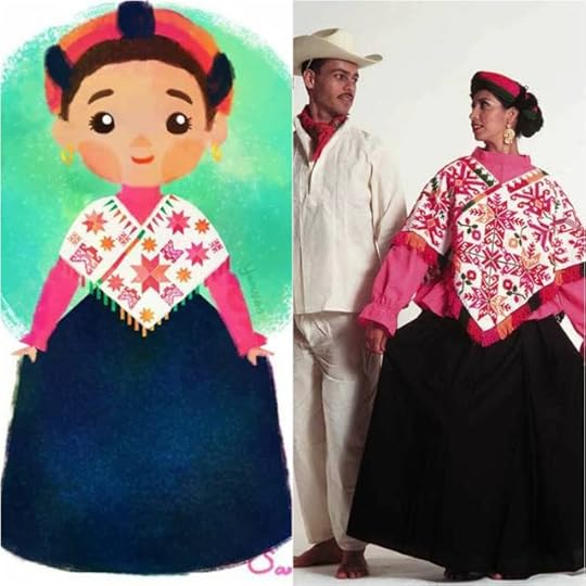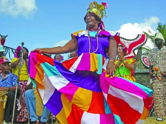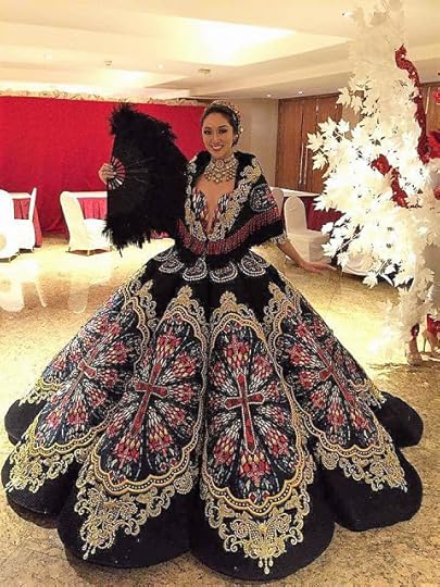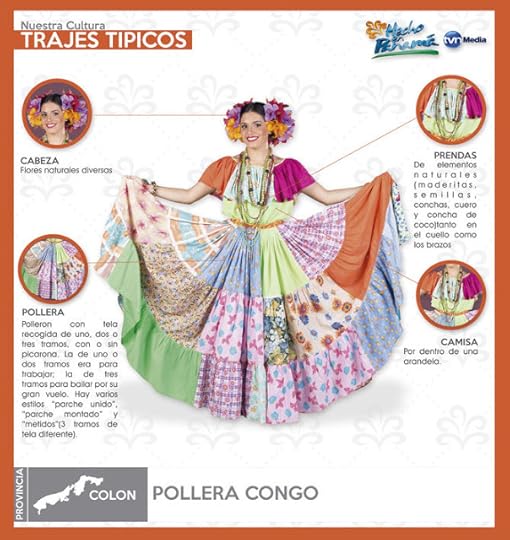 The costume represents the women of this area and their traditional dress. The woman is THE QUEEN and head of the family and therefore, the crown. The mixed pieces of fabric comes from when the ethnically African people in Panama were slaves, their masters would only give them leftovers of their fabric to use on their clothes and therefore, that's how they made their polleras...using discarded fabric from their Masters. The costume and overall look just made me smile. She may be barefoot but she looked RICH and EXUBERANT.