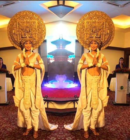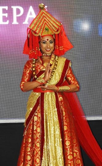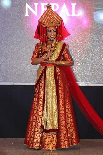 Miss Universe Nepal Nagma Shrestha: Titled "Embodiment of Spirituality", the first ever Miss Universe Nepal will be wearing this as her national costume. It was designed by Bina Ghale and her dramatic and very impressive headgear depicting a mandala (an ancient confederation marked by cultural, religious and political boundaries which lies in present day Nepal) was designed by Bijay Maharjan.