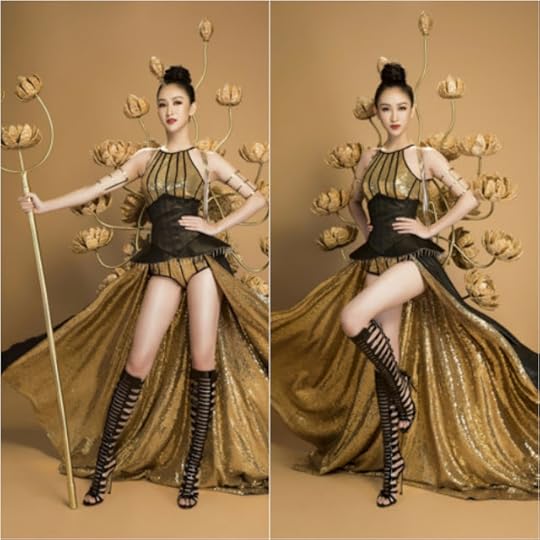 12. Miss Earth Vietnam La Thi Ha Thu: Made by Vietnamese designer Nguyen Minh Cong from one of his recent collections entitled "The Dreamers", this costume worn by "Miss Earth Vietnam" represents a strong female soldier. Made of a natural silk fabric, as well as glittering lame fabric, the look features a leotard/body suit, midriff peplum corset, overskirt and lotus flower details. The lotus flowers symbolize the "sturdiness and softness of Vietnamese women" according to the designer . I thought it was chic, modern and costume-impacting. I just wished she would have worn THE SAME DIVA shoes she wore in the pre-pageant photoshoot above--as opposed to the actual contest! What happened to those fabulous shoes? Were they lost in a luggage snafu?