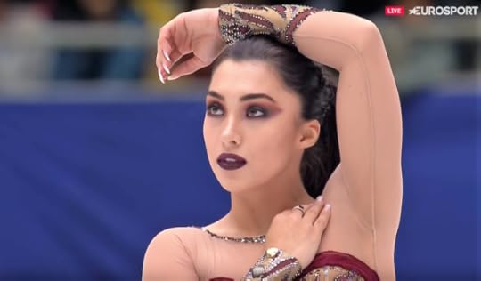 Free Skate to La Terre vue du ciel by Armand Amar, edited by Maxime Rodriguez: For their Free Skate, they made me proud in that Bruno wasn't wearing stuff from his closet and that they both matched and looked LIKE A PAIR (what a novel idea!). Her lilac colored ombre-dyed costume was exquisite, especially the sequin work and that fabulous back! And...(this is something I JUST NOTICED!): She also LOVES a high neck and here it was being featured, of course. Speaking of necks...