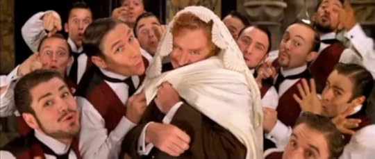 Bruno's Nude Illusion Neck-piece: I was a bit perplexed about his nude illusion neck-piece. I wondered why he even needed it and instead, just let him show some actual SKIN (Hello!!!). It was kind of tacky and very noticeable. After closer inspection, I realized that maybe it was an "after thought"--after they made his costume, I bet that stand up collar and small v-neck just kept flopping down and so...they decided to add that nude illusion piece. I wonder.