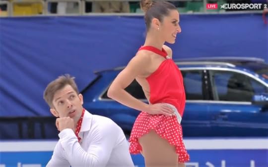 Free Skate to Amarcord by Nino Rota: Once again, Marchei and Hotarek went the Italiano route; this time for their Free Skate, they skated to the music of the Academy Award-winning Federico Fellini film "Amarcord". They were bold and fun in their "Harlequin" print embellished costumes in black, red and white. It was kooky and slightly "Circus"-like but visually, at least it got me to pay attention. I wished his vest (which matched her dress) was tighter...