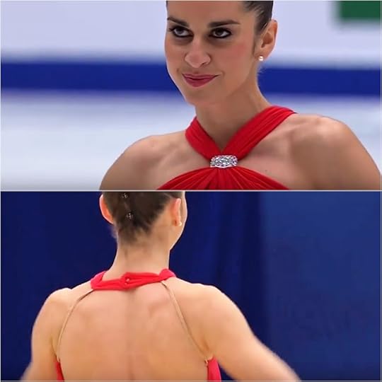 Free Dance to Je suis malade performed by Lara Fabian: For their Free Dance, they wore these looks. She wore a scarlet red cowl-neck slip dress (with an intentionally off-the-shoulder strap). And he wore a blue-gray tuxedo shirt and deep gray pants. If you think you have seen these before, well...maybe: This was the same Free Skate music AND very similar COSTUMES they used back in the 2011-2012 Season (also used in for Exhibition Program in 2011-2012 and 2012-2013). The difference (I think) is that this new costume isn't beaded at the satin cowl front top section (as opposed to the earlier version) and maybe his pants are not as "boot-cut" in the leg. Here are the "earlier costumes":