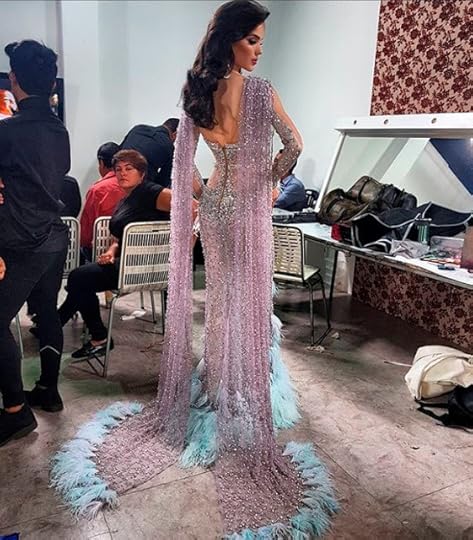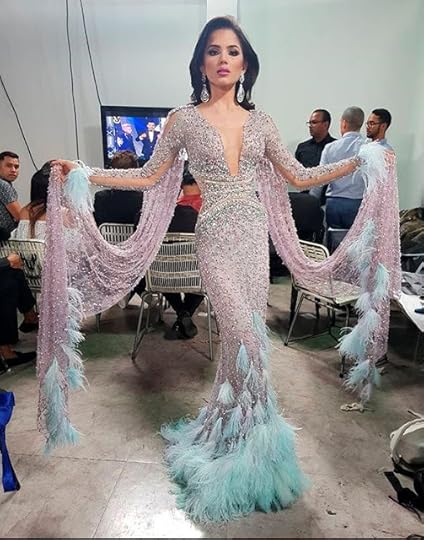 10. Miss Tachira Maria Sofia Contreras: Maria Sofia wore this silver/ivory/lilac/nude gown from designer Dheymid Galaviz . It was pretty impressive! The gown featured 10,000+ pastel colored sequins sewn on the gown, a "plunging" neckline with nude illusion panel, as well as dramatic back falls...oh and yes, there were baby blue colored ostrich feathers on the hem of the gown and those falls. I would have probably removed those feathers, otherwise, this was a VERY FABULOUS gown.