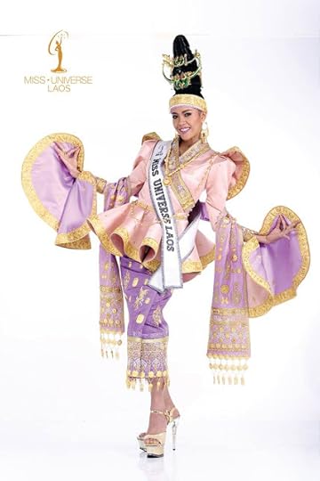 Miss Universe Laos Souphaphone Somvichith: Inspired by the Luang Prabang traditional dress, Miss Universe Laos' national costume is made in beautiful silk using powder pink, lavender as the main colors with gold embroidery, all topped off by a fabulous headdress.