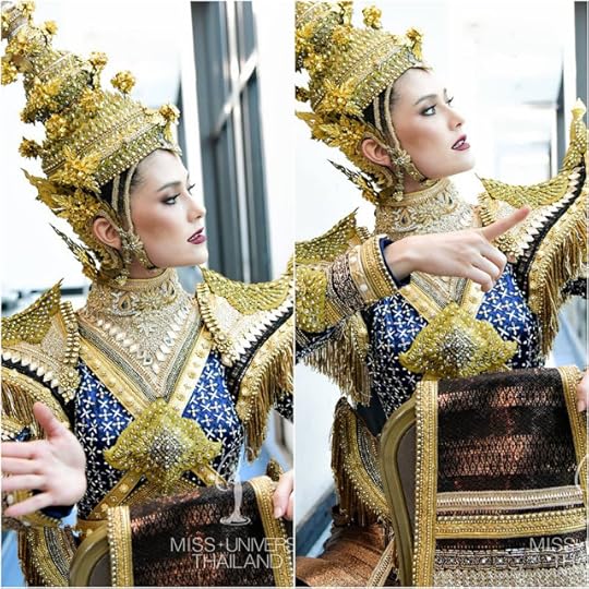 Designed by Prapakas Ansusingha, the costume is inspired by Thai mythology of Mekkala "the Goddess of Lightening" and Ramasoon "The Thunder God". The entire "costume" comes with the golden doll, which I assume she will roll onto the stage, to complete her national costume look. The incredible headpiece was created by Toi Marilyn.