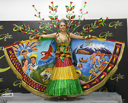 Miss Universe Bolivia Gleysi Noguer: This colorful costume was designed Rommel Rojas and was inspired by Bolivia's national flowers of Cantuta and Patuju. The flowers are seen protruding from her back and wrapped around her arms and were all sewn by hand. The costume also features a cape showing scenes representing all of Bolivia.