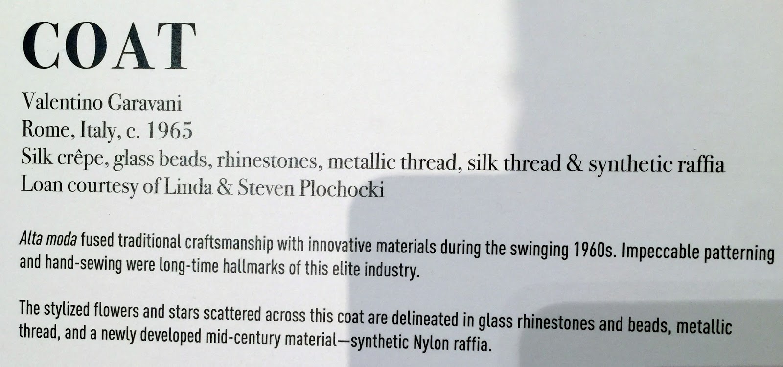 Alta Moda: 1965 Valentino Garavani silk crepe coat with glass beads, rhinestones, metallic and silk thread and synthetic raffia--"Fashion Philanthropy: The Linda and Steven Plochocki Collection" Exhibition FIDM Museum, Downtown Los Angeles